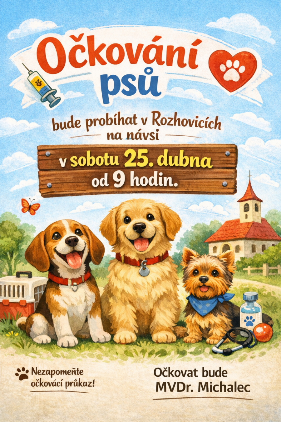V sobotu 25. dubna 2026 od 9:00 hodin proběhne na návsi v Rozhovicích očkování psů. Očkování zajistí MVDr. Michalec. Žádáme majitele psů, aby si s sebou nezapomněli očkovací průkaz psa. Děkujeme za spolupráci.