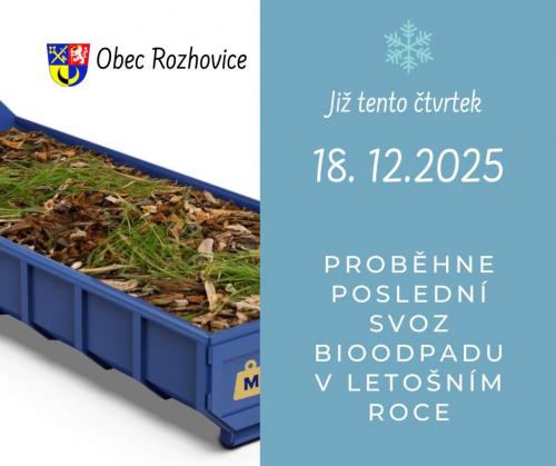 Upozornění pro občany Již tento čtvrtek 18. 12. 2025 proběhne v obci Rozhovice poslední svoz bioodpadu v letošním roce. Děkujeme za spolupráci.